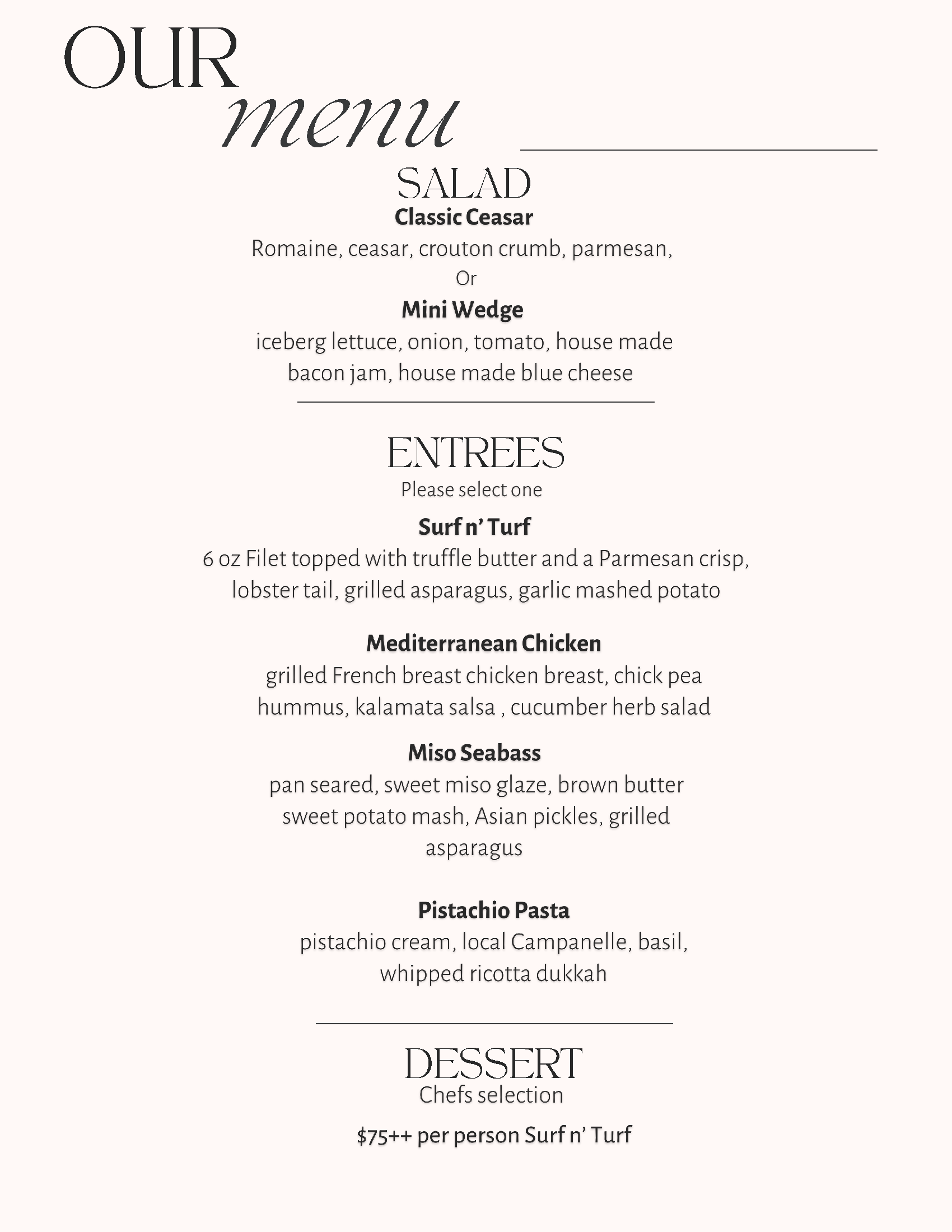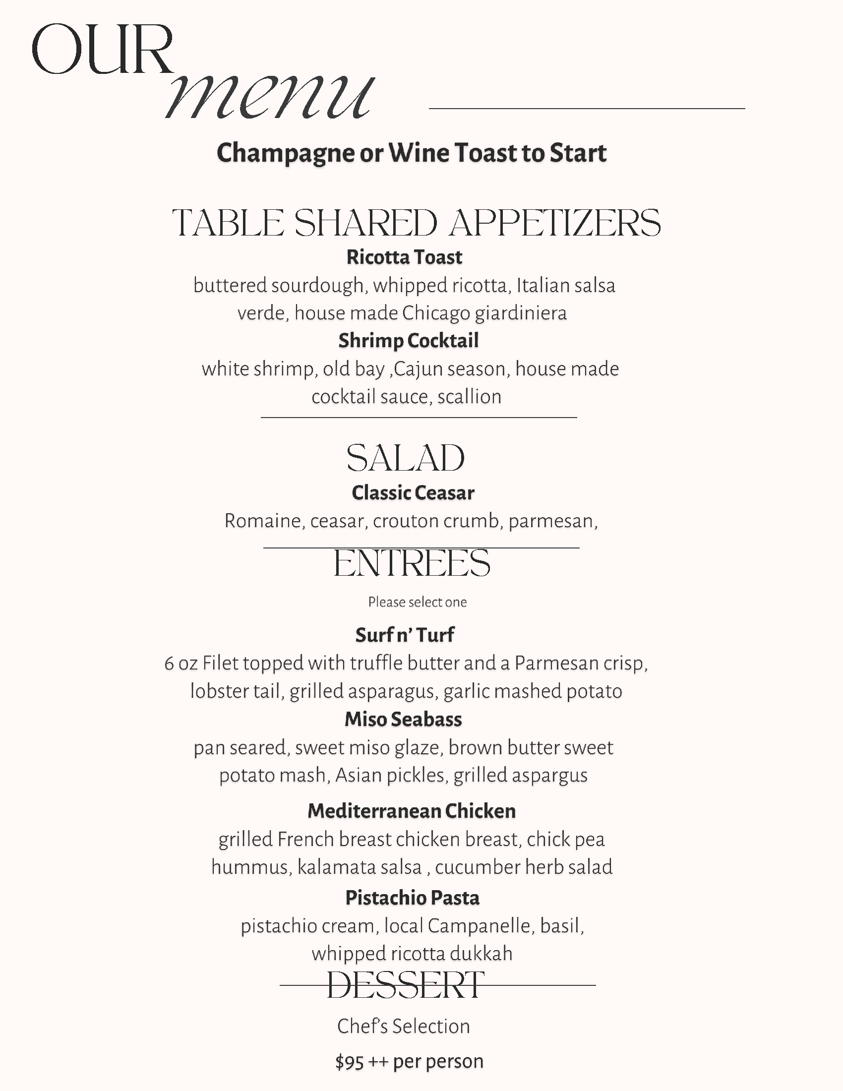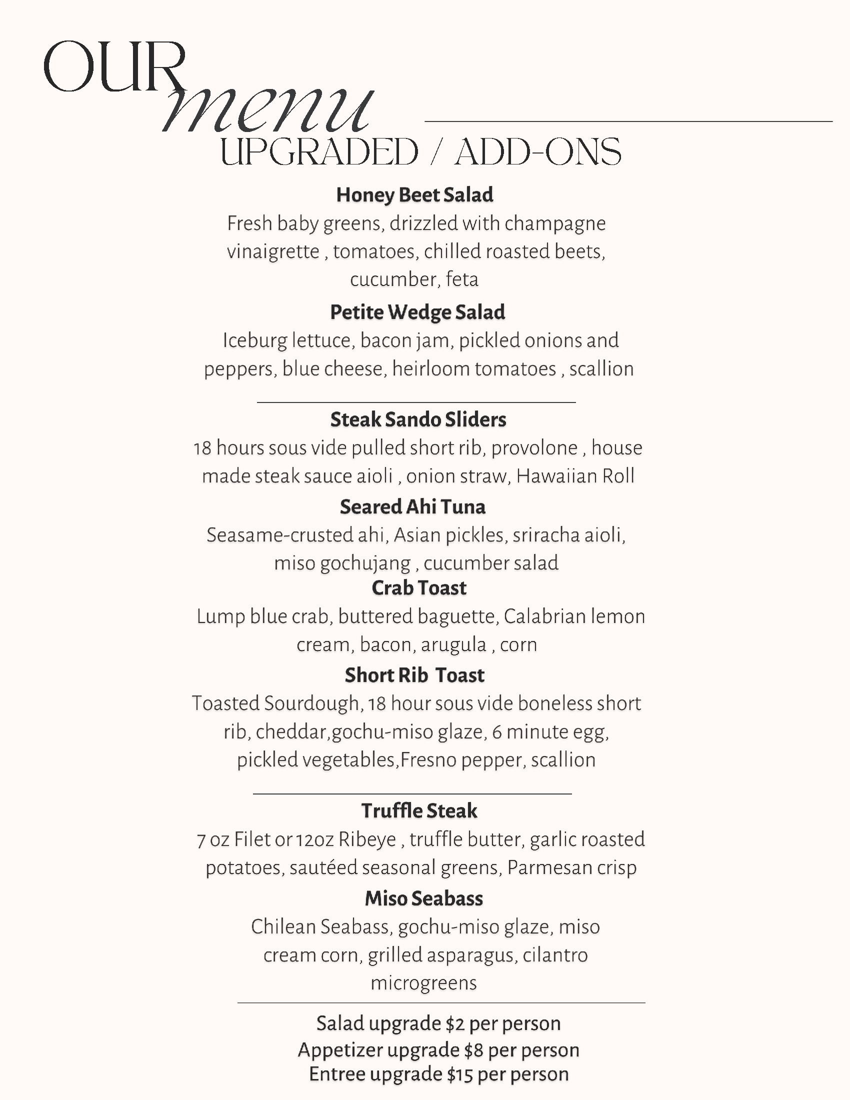 *Substitutions are not recommended but will be made with an appropriate upcharge. Consuming raw or undercooked meats, poultry, seafood, shellfish, eggs or unpasteurized milk may increase your risk of food-borne illnesses.